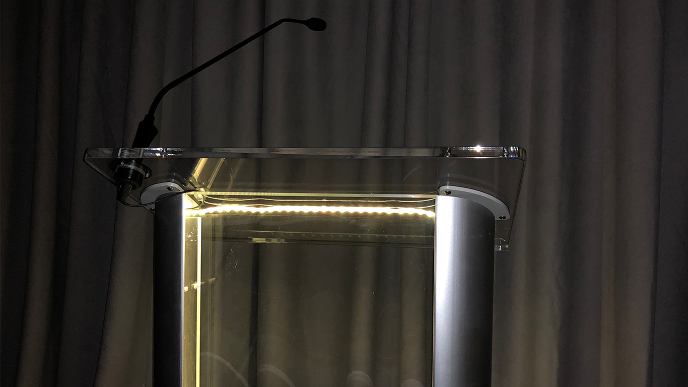 Acrylic podium with shock mount gooseneck microphone and LED lights with DMX control.